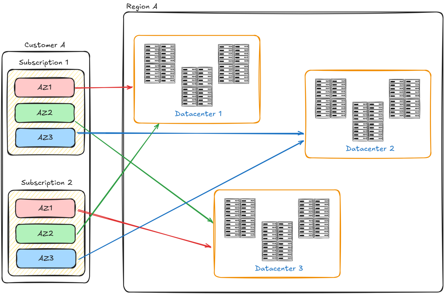 - Zone 1 in another subscription may map to Physical Datacenter B or C